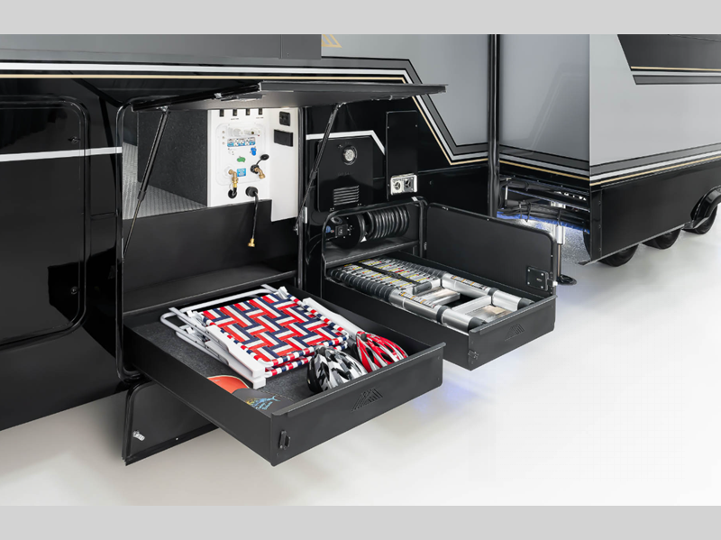 Sleeps 4 Slides 3 Length 45 ft 11 in Ext Width 8 ft 5 in Ext Height 13 ft 4 in Interior Color Sahara Exterior Color Optional Full-Body Paint; Silver & Black, White & Black, Gold & Black, Metallic Hitch Weight 3450 lbs GVWR 23000 lbs Dry Weight 18600 lbs Fresh Water Capacity 150 gals Grey Water Capacity 156 gals Black Water Capacity 85 gals Tire Size 215/75 R17.5H Furnace BTU 35000 btu Generator FlexPower 5500 Fuel Capacity 60 gals Number Of Bunks 1 Available Beds King Refrigerator Type GE Energy Star with Ice Maker and Filtered Water Refrigerator Size 19 cu ft Convection Cooking Yes Cooktop Burners 4 Shower Size 30" x 42" Number of Awnings 4 Axle Weight 7000 lbs Garage Size 12 ft 6 in LP Tank Capacity 30 lbs Water Heater Type Tankless AC BTU 40500 btu TV Info LR 50" Smart TV & Televator, Garage 43" Smart TV, BR 32" Smart TV Awning Info 10' 6", 15', 14' 6" and Rear Power w/Neon Lights Axle Count 3 Washer/Dryer Available Yes Number of LP Tanks 2 Shower Type Standard Electrical Service 50 amp Solar Wattage 800 watts Similar Floorplans