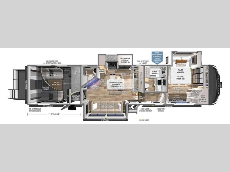 Unmatched luxury, an automotive exterior, tons of storage space, and intelligent features; it has to be a Model G toy hauler fifth wheel by Brinkley!