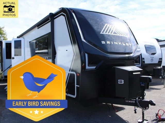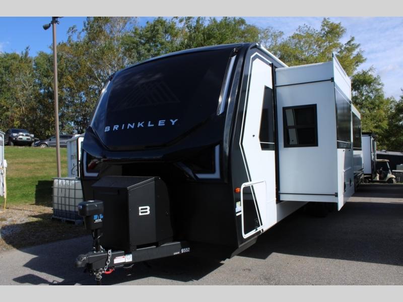 The drop frame chassis will provide a smooth tow from home to campground, and the one-touch automatic leveling system will have you set up in no time. You will love the sleek styling with automotive-grade exterior graphics, along with the square Euro frameless windows with 6" openings. Inside, there are premium residential cabinet and drawers, solid surface countertops, Brinkley's CraftSense wood trim construction, and many more premium features.