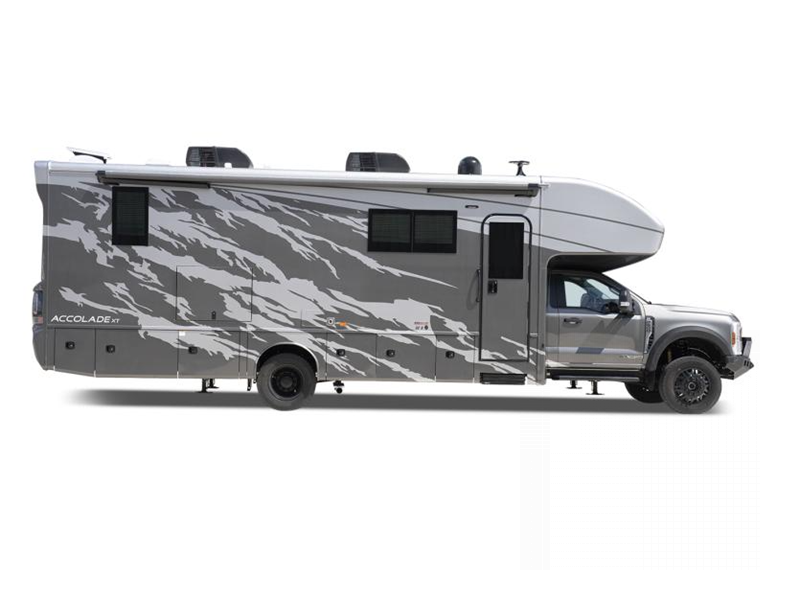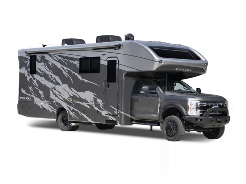 The Accolade XT from Entegra Coach is a Super C diesel motorhome like no other. With a tough exterior appearance and a comfortable interior, you will enjoy hours of fun in this motorhome. The Ford F600 4X4 chassis or Ford F550 4x4 chassis (depending on which model you choose) is ready to go anywhere, and the all-terrain tires with HiSpec matte black aluminum rims enhance the appearance.