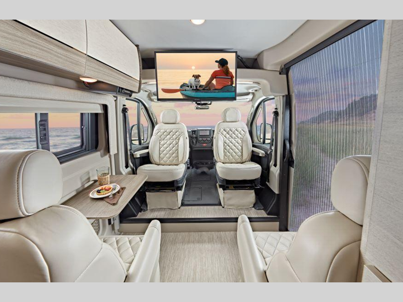 - E-Z Drive™, Thule armless patio awning with LED light strip, Thule roof rack, induction cooktop, hydronic heating system, swivel driver and passenger seats with 6-way lumbar adjustment, Winegard Connect 2.0 4G/Wi-Fi/digital TV antenna