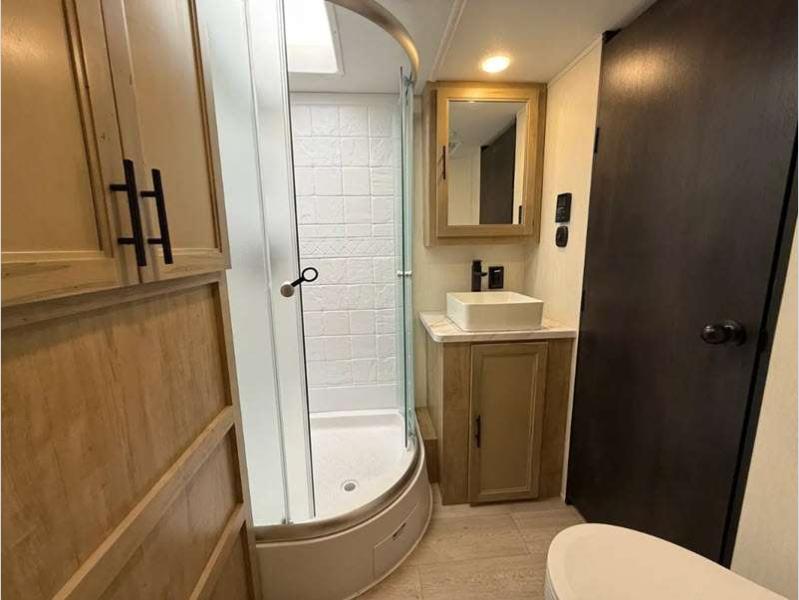 Sleeps 4 Length 33 ft 3 in Ext Width 8 ft Ext Height 10 ft 8 in Int Height 0 ft Hitch Weight 989 lbs GVWR 7989 lbs Dry Weight 6412 lbs Cargo Capacity 1577 lbs Fresh Water Capacity 52 gals Grey Water Capacity 38 gals Black Water Capacity 38 gals Furnace BTU 20000 btu Available Beds RV King Refrigerator Type 12V Cooktop Burners 3 Number of Awnings 1 Garage Size 13 ft Water Heater Type Tankless AC BTU 15000 btu Awning Info 15' Full Length Power w/LED Light Strip Axle Count 2 Shower Type Standard Solar Wattage 200 watts Similar Floorplans