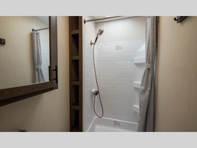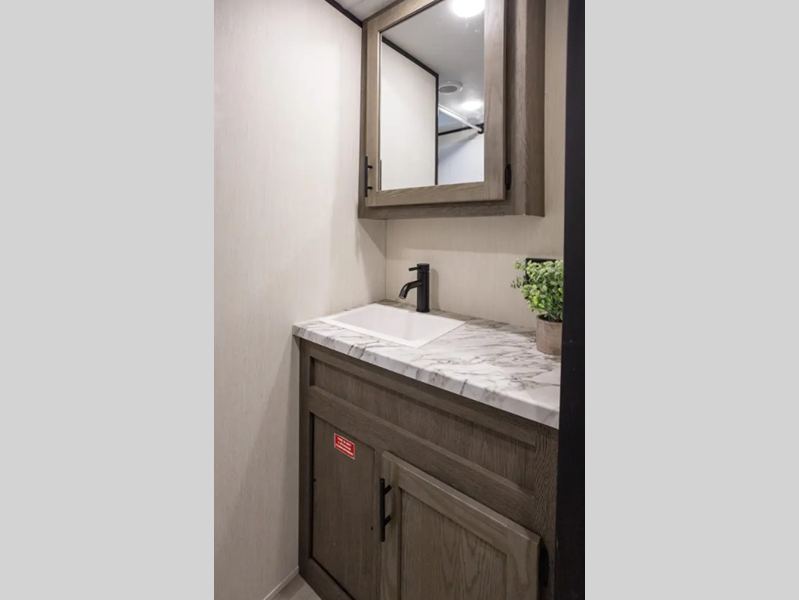 You will love the real wood cabinet doors and drawers inside, along with LED lights and a black stainless steel farm sink that will have you feeling more at home. There are power stabilizer jacks to make your RV more secure, and the power awning with LED accent lighting will create an outdoor space campground neighbors will want to check out.