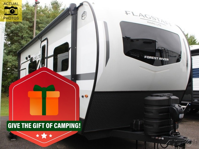 With any Flagstaff Micro Lite travel trailer by Forest River you will enjoy lightweight towing, durable construction, and added interior comforts to make each trip memorable! Each model features RoadTech tire pressure monitoring, Dexter Torflex axles, and nitrogen-filled Goodyear endurance tires for smooth towing from home to campground. The 6-sided aluminum framed construction provides a strong foundation so you can enjoy your RV for years to come, plus the radiant foil in the front cap, underbelly and slides help insulate your trailer. Additional exterior features include a 200W solar panel, back-up camera prep, frameless windows, and slam baggage doors. Each model includes the Great Expectations Package with roller shades, solid surface kitchen countertops, and hidden hinge cabinet doors. There is also an exterior hot/cold water port, outside speakers, a power tongue jack and stabilizer jacks, plus many more conveniences.