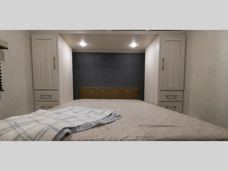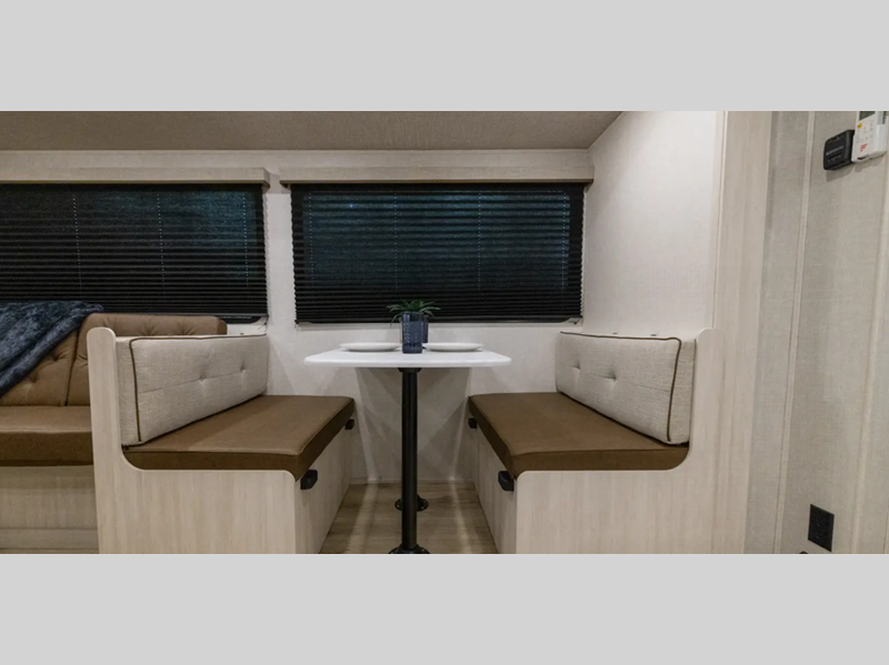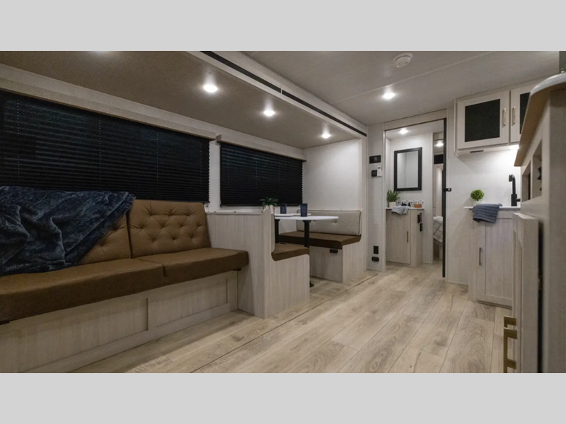These travel trailers are extended season ready with a 2" aluminum framed floor and block foam insulation, plus there is a sealed underbelly with forced heat and radiant foil insulation. You'll love the Surf(X) seamless countertops throughout, and there is a tankless water heater for endless hot showers. Outside, a power tongue jack is ultra convenient and there is a hot and cold spray port to wash off hiking gear!