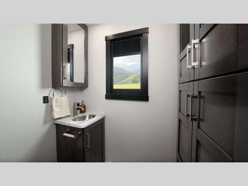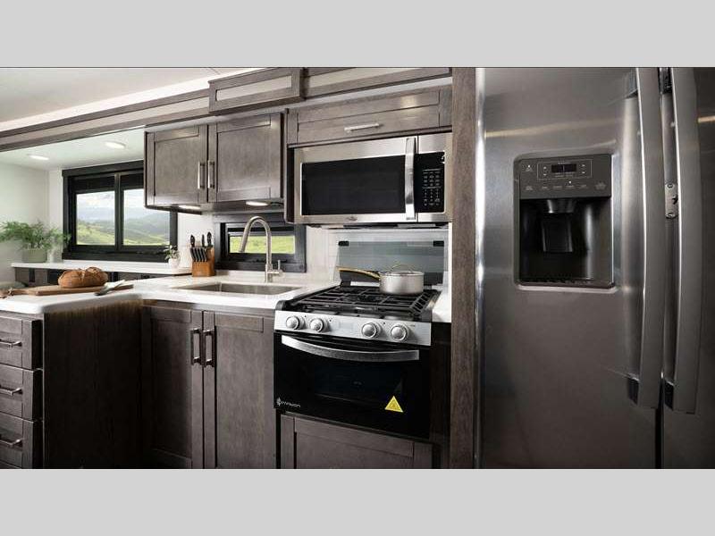 The JRide Plus will provide precise handling and stability as you travel across the state or country, and the Stronghold VBL lamination is the lightest, yet strongest construction in the industry so you can enjoy your coach for all your adventures. There are solid surface kitchen countertops inside, along with decorative kitchen backsplash, hardwood cabinet doors, and large wardrobes to easily store your belongings.