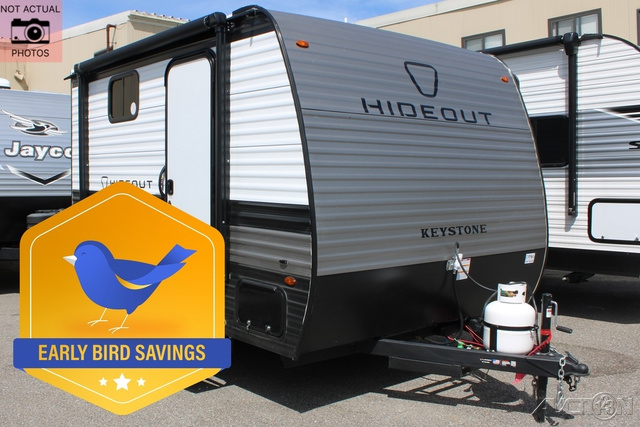 With any Hideout Mini travel trailer by Keystone, you will enjoy lightweight towing thanks to their single-axle! The AlphaPly TPO roof membrane is ultra durable, and the power awning will provide protection from the sun as you relax in your camp chairs outside. Each model includes blackout night shades, LED lighting, plus many more interior comforts. There is also a roof A/C and 20K BTU furnace to keep you comfortable, plus a tankless water heater for endless hot showers!