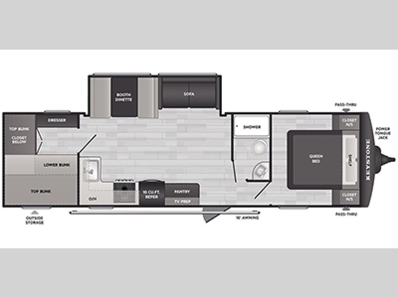 You will love the sophisticated interior decor, along with blackout night shades for added privacy and a tankless water heater. The I-beam frame features stamped steel cross-members and outriggers for maximum strength, and there is a walkable roof so you can easily clean your unit after a week in the woods. Heavy duty stabilizer jacks make set up easier than ever, and you'll have a power awning to relax under once your campsite is ready to go.