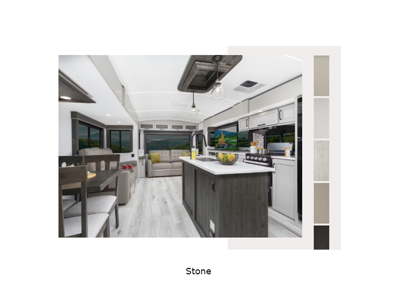 Sleeps 5 Slides 2 Length 31 ft 3 in Ext Height 11 ft 4 in Int Height 6 ft 6 in Interior Color Stone, Tobacco Exterior Color Royal Gold, Obsidian Hitch Weight 1005 lbs Dry Weight 7475 lbs Cargo Capacity 2025 lbs Fresh Water Capacity 54 gals Grey Water Capacity 76 gals Black Water Capacity 38 gals Tire Size ST225/75R15E Furnace BTU 35000 btu Available Beds King Refrigerator Type 12V GE Refrigerator Size 10 cu ft Cooktop Burners 3 Shower Size 34" Number of Awnings 1 Axle Weight 5100 lbs LP Tank Capacity 30 lbs Water Heater Type On Demand AC BTU 15000 btu TV Info LR HDTV Awning Info 19' Lighted Power with Adjustable Arms Axle Count 2 Number of LP Tanks 2 Shower Type Radius Similar Floorplans