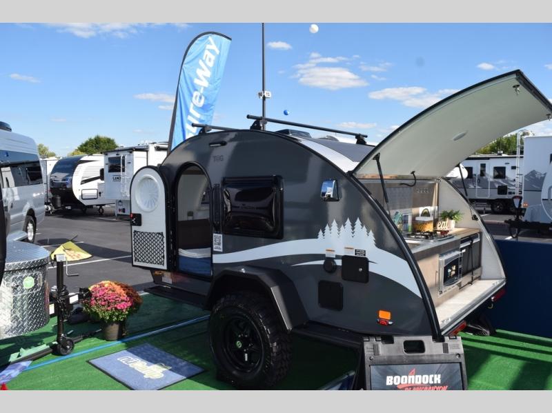 The TAB 400 is built with the unique teardrop design on a single axle, and includes composite flooring, molded underbelly shield, and a rear stargazer window allowing you to stargaze at night. There is a 310-watt solar panel included allowing you to camp off-grid, and the Alde central heating/hot water system plus the central air conditioning will keep you comfortable whichever season you camp. You will also love the interior that offers a spacious wet bath, dual sleeping areas, and kitchen amenities. The Boondock package comes standard, but you can also choose the optional Black Canyon Upgrade with an additional solar panel, holding tank heaters, underglow lights, and an XL diamond plate storage tub!